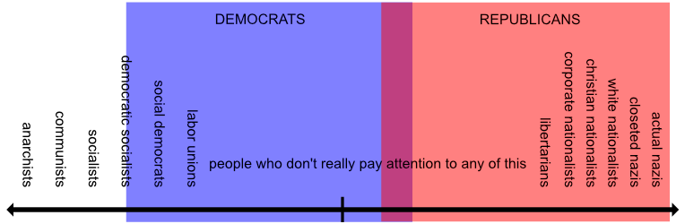 The left side of the Democratic party just barely touches on democratic socialism, which describes folks like Alexandria Ocasio-Cortez and newly-elected Zohran Mamdani; they are about as far to the left side of the spectrum as the actual Democtratic party goes. This leaves a pretty wide swathe of legitimate political philosophies on the left, ones with actual historical and philosophical backing, completely beyond the pale in mainstream discourse.